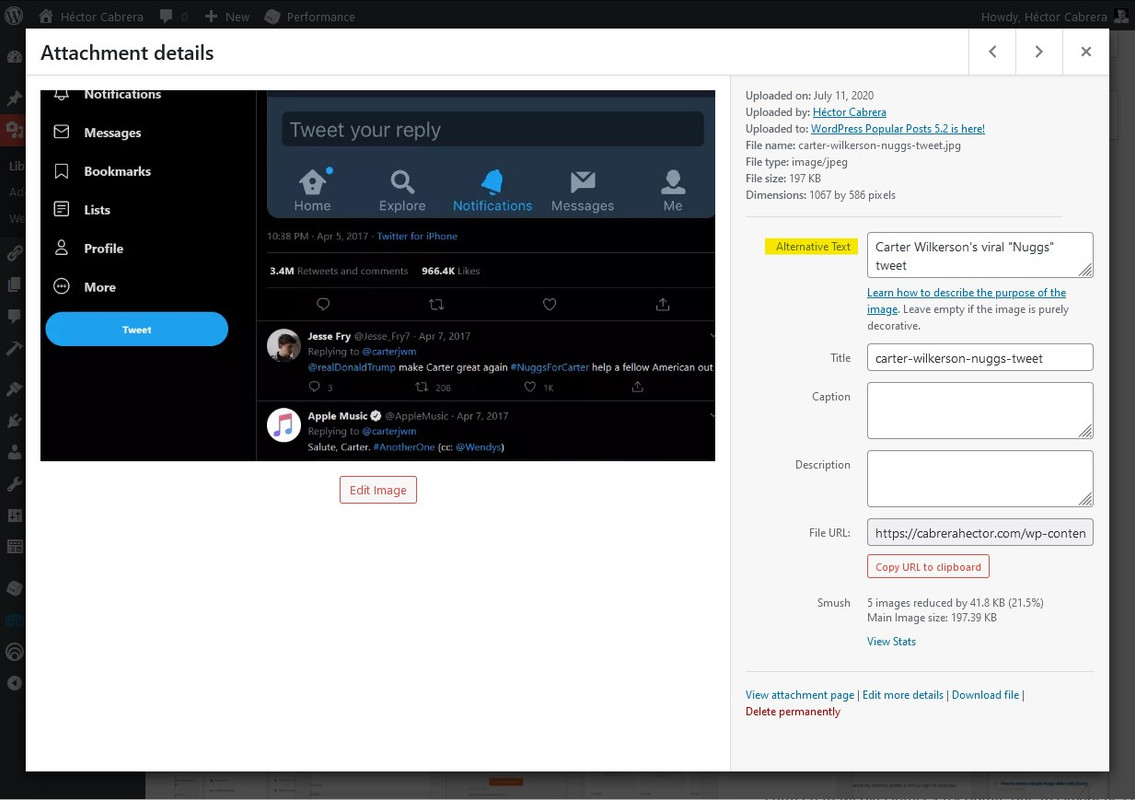 Entra en tu Media Library y asegúrate de que tus imágenes tienen el campo Alternative Text lleno con texto que describa lo que se muestra en la imagen.