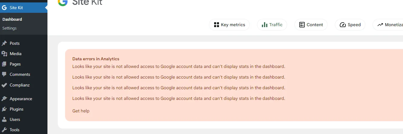 “Looks like your site is not allowed access to Google account data and can’t display stats in the dashboard.”